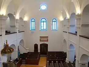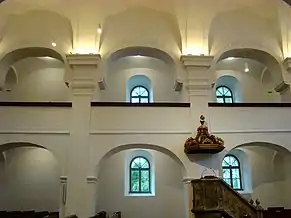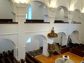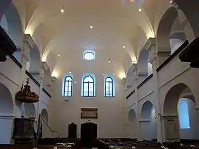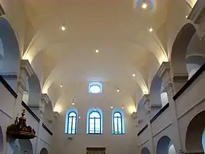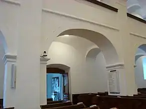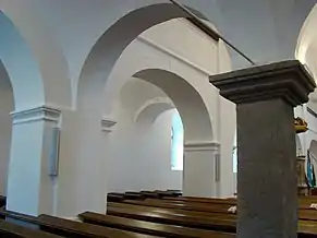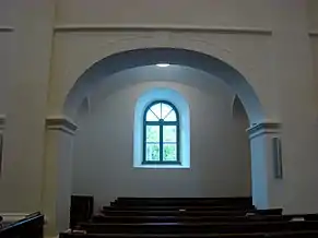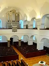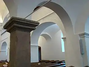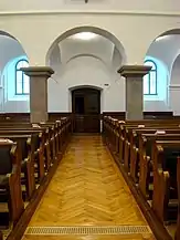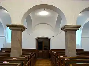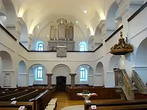 Biserica are o suprafață de 588 m², are un aspect simplu, îmbinând caracteristici ale barocului și ale clasicismului. Interiorul armonios este acoperit de arcade, fiind defalcat de două galerii laterale și o strană pentru orgă. Galeriile sunt sprijinite pe piloni, aceștia la rândul lor fiind delimitați de arcade în formă de semicerc[2].