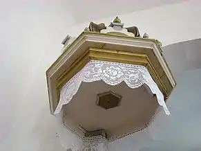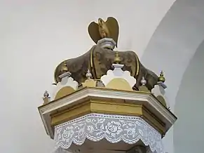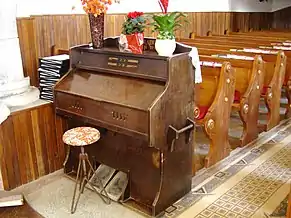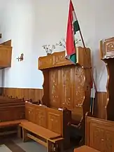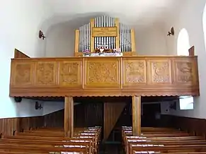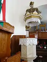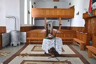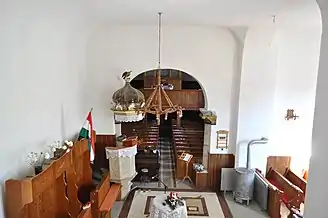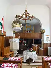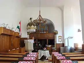 Din mobilierul bisericii realzat de Umling, a mai rămas doar coroana amvonului. Amvonul sculptat în piatră este opera lui David Sípos din 1765. În 1992, biserica a primit mobilier cu elemente noi ale simbolurilor bisericii. Vechea orgă realizată de meșterul Kolonits a fost înlocuită în anul 1993 cu una nouă construită de József Molnár[2].