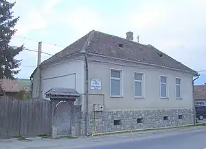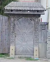 Pe frontonul triunghiular al portalului romanic s-a păstrat o pictură murală de mare valoare, reprezentând Crucificarea. Corpul crucificat al lui Iisus este încadrat de figurile celor trei Marii, respectiv al Sfântului Ioan Evanghelistul și al Sfântului Petru. Sub brațele crucii apar doi îngeri ținând în mâini filactere cu inscripții cu minuscule gotice[3].