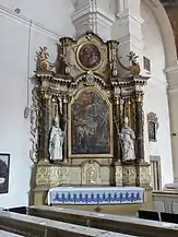 Altarul principal a fost construit în anul 1780, altarul sfântului Ioan Nepomuk în 1776, din donația generoasă a armeanului János Lukács, iar altarul Sfântul Ioan Botezătorul în 1775, din donațiile lui Jakab Lukács. Amvonul baroc al bisericii este bogat în decorații sculpturale. Parapetul amvonului este decorat cu figurile celor patru părinți ai bisericii, pe coroana amvonului apar cei patru evangheliști, iar în vârf figura lui Isus, reprezentat ca Bunul păstor. În cor se află statuia Sfântului Nicolae în mărime naturală, care se presupune că făcea parte din decorația unui altar poliptic medieval. Statuia este într-o stare avansată de degradare. Pe latura sudică a navei, într-o nișă trilobată apare scena Răstignirii compusă din statui: central este Hristos răstignit, la picioarele sale Maria Magdalena îngenunchiată, flancate de reprezentările Maicii Domnului și a Sfântului Ioan. În singura capelă laterală a bisericii se mai găsește un altar cu baldachin, datat la sfârșitul secolului al XVIII-lea.