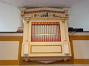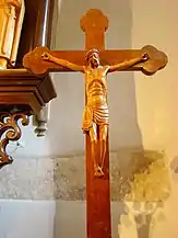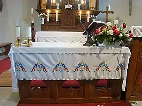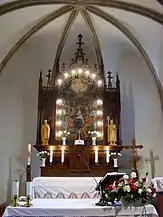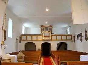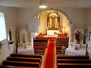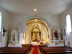 Biserica are trei altare: altarul principal din lemn și două altare secundare, construite în 1943. Orga a fost construită la Târgu Secuiesc, de meșterul Kolonics István, în 1892. În turnul construit în 1764 se află trei clopote, cel mai vechi fiind turnat în anul 1626[3].