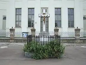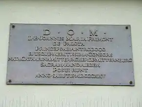 În 1831 ctitorul, prințul Frimont, a murit la Viena, iar trupul neîsuflețit a fost transportat la biserica din Palota și depus în cavou, conform testamentului. Cavoul este realizat, în partea de sus, din marmură albă de Carrara, iar în partea de jos, din marmură roșie de Salzburg.