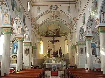 Deasupra altarului bisericii parohiale se află un complex statuar reprezentând scena de pe Calvar: Isus răstignit, încadrat de sfânta Fecioară îndurerată, apostolul Ioan și Maria Magdalena la picioarele crucii. Pe boltă, deasupra acestui complex statuar este reprezentată Schimbarea la față (hramul bisericii).