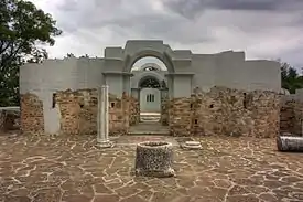![]() Ruinele bisericii rotunde din Preslav. Vedere de la intrarea în atriu, privind către nartex și porțile rotunda, cu absidele în depărtare | |