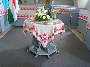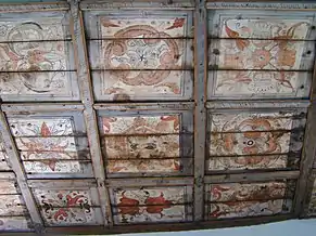 Biserica are un tavan casetat realizat în anul 1667. Cu 63 de panouri (9 în lungime și 7 în lățime), tavanul poate fi clasificat ca fiind de dimensiuni medii. Pe una dintre cele două casete inscripțonate din centru scrie: Illius in Laudem reparantur tecta perennem/Qui Deus est solus Primaque Causa Boni. Data mai sus - AD: 16 67. Meșterii care au realizat tavanul casetat au fost Kozma Mihály, Havadi András și Sipos János Dékány[3].