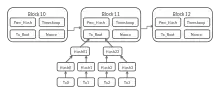 Blocurile dețin seturi de tranzacții care sunt indexate și codificate într-o structură specială de date numită arbore Merkle.[1] Fiecare bloc include hash-ul criptografic al blocului anterior din blockchain, prin care se leagă astfel cele două blocuri, formând un lanț.[1] Verificarea repetată a integrității blocurilor precedente poate fi făcută până la începutul lanțului, la „blocul geneză”.[47] Uneori, în paralel cu lanțul principal, pot apărea lanțuri secundare printr-un proces cu numele de „forking”. Blocurile din lanțurile secundare sunt numite „blocuri orfane”.[47]