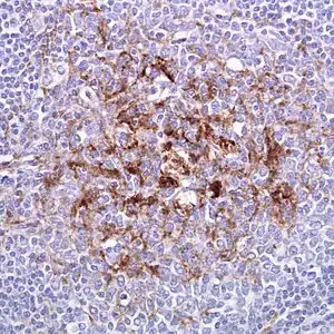 ![]() Biopsia amigdaliană în boala Creutzfeldt-Jakob variantă. Imunocolorarea proteinei prionice. | |