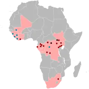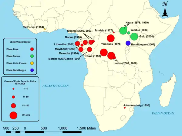 | 1994 | Coasta de Fildeș | Ebolavirusul pădurii Taï | 1 | 0 | 0 | Un om de știință s-a îmbolnăvit după efectuarea autopsiei unui cimpanzeu sălbatic în pădurea Taï. Pacientul a fost tratat în Elveția.[15] |
