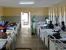 ![]() Fotografie din 1976 ce prezintă două asistente stând în fața lui Mayinga N., o persoană cu boala virală Ebola care a murit câteva zile mai târziu din cauza unei hemoragii interne severe. | |
