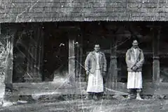 Bărbaţi purtând zadie, în faţa bisericii de lemn.