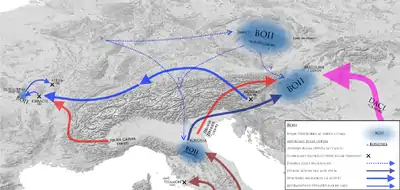 Strabon confirmă că boii au imigrat venind din teritoriile lor situate la nord de Alpi[10] adăugând că au fost unul dintre cele mai mari triburi ale celților.[11]