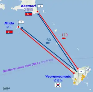 Frontiera maritimă disputată dintre Coreea de Nord și Sud. Coreea de Nord revendică apele de la nord de linia roşie; Coreea de Sud revendică apele de la sud de linia albastră. Yeonpyeong este marcată cu 1 pe hartă.