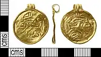 - en Un bracteat aflat la Muzeul Britanic, care imită, în mod clar, o monedă romană bătută sub Constantin cel Mare.