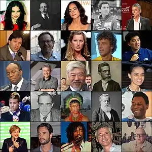 Primul rând: • Adriana Lima • Alberto Santos-Dumont • Alice Braga • Ayrton Senna • Chico Buarque Al doilea rând: • Fernando Haddad • Fernando Meirelles • Gisele Bündchen • Gustavo Kuerten • Hugo Hoyama Al treilea rând: • Joaquim Barbosa • Marcos Pontes • Luiz Gushiken • Machado de Assis • Marina Silva Al patrulea rând: • Neymar • Oscar Niemeyer • nativ Pataxó • Pedro II • Pelé Al cincilea rând: • Zilda Arns • Rodrigo Santoro • Seu Jorge • Sérgio Vieira de Mello • Vinícius de Moraes | |||||||||||||||||||||||||||||||||||||||||||||