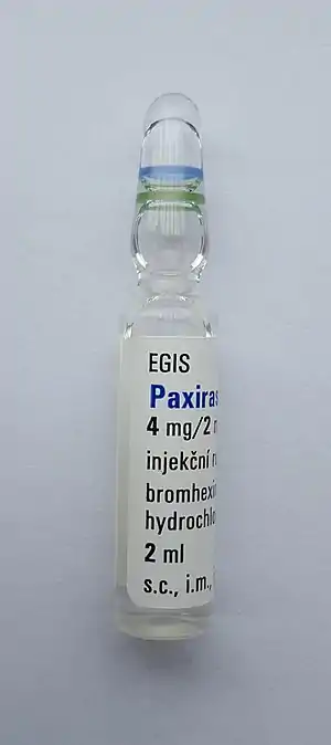 Bromhexin sau Bromhexina este un medicament mucolitic utilizat în tratamentul tulburărilor respiratorii asociate cu mucus vicios sau excesiv.[9] A fost derivat inițial ca un derivat din extract numit vasicinonă din planta indiană, Adhatoda vasica.[10]