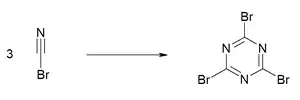Compusul trimerizează la un compus heterociclic denumit bromură cianurică, iar reacția este catalizată de brom, săruri metalice, acizi și baze.[4]
