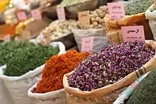 Unul dintre condimentele iraniene tradiționale și cele mai răspândite este șofranul, derivat din floarea Crocus sativus . Apa de trandafiri, o apă aromată făcută prin înmuierea petalelor de trandafir în apă, este, de asemenea, un ingredient tradițional și comun în multe feluri de mâncare iraniene.