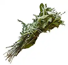 Buchet garni din cimbru, foi de dafin, și salvie, legat cu o sfoară