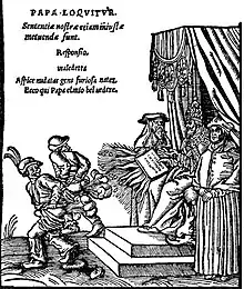 Dintr-o serie de xilografii (1545) denumite Papstspottbilder,[4] de Lucas Cranach, comandat de Martin Luther.[5]Sărutul picioarelor Papei[6] (Țăranii răspund la o bulă papală a lui Paul al III-lea astfel, spune legenda: „Nu ne speriați cu interdicția voastră și nu fiți atât de furios. Altfel vă vom arăta spatele nostru.”)[7][8]