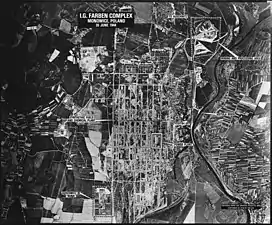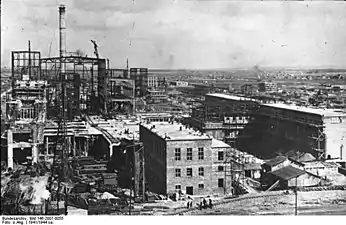 Compania I. G. Farbenindustrie(en)[traduceți] din Frankfurt pe Main a cerut înființarea combinatului Buna IV în lagărul de concentrare de la Auschwitz sub supravegherea Schutzstaffel (SS), profitând de situația în care se aflau prizonierii.[34] Comandantul SS Heinrich Himmler a considerat decizia binevenită,[34] iar în primăvara anului 1941 a ordonat autorităților din Auschwitz să aloce 10 000 de prizonieri pentru a construi un combinat de cauciuc sintetic și combustibili pentru Buna-Werke în Dwory, din cadrul concernului I. G. Farbenindustrie.[35] Pentru amplasarea acestuia au fost luate în considerare accesul la calea ferată, apă și materii prime precum cărbune, calcar și sare iar forța de muncă din lagărul de concentrare Auschwitz din apropiere.[35] De asemenea, zona se afla dincolo de raza de acțiune a bombardamentelor aliaților.[35]