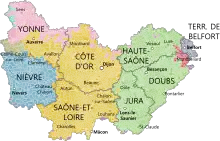 Capitală și cel mai mare oraș este Dijon, iar sediul Consiliului regional se află în fosta capitală a Franche-Comté, orașul Besançon. Unul dintre departamentele regiunii este Teritoriul Belfort, cel mai mic departament din afara regiunii pariziene.