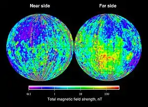 Câmpul magnetic al Lunii este foarte slab în comparație cu cel al Pământului. Alte diferențe majore sunt că Luna nu are în prezent un câmp magnetic dipolar (ca și cum ar fi generat de un geodynam în centrul său) și magnetizarea variată prezentă este aproape în întregime crustală la origine. O ipoteză susține că magnetizările la nivelul scoarței au fost dobândite la începutul istoriei lunii când un geodynam era încă funcțional. O analiză a unei roci lunare magnetizate aduse pe Pământ de către astronauții de pe Apollo a arătat că luna trebuie să fi avut un câmp magnetic puternic, acum cel puțin 4,25 miliarde de ani, câmp care apoi s-a redus treptat până acum 3,1 miliarde de ani.[1] Dimensiunea mică a miezului lunar, cu toate acestea, este un potențial obstacol pentru promovarea respectivei ipoteze la statutul de teorie. Alternativ, este posibil ca pe un corp fără aer, cum este Luna, câmpurile magnetice tranzitorii ar fi putut fi generate în timpul marilor evenimente de impact. În sprijinul acestui fapt, s-a observat că cea mai mare magnetizare a scoarței pare să se fi situat în apropierea antipozilor craterelor de impact uriașe. S-a teoretizat că un astfel de fenomen ar fi putut rezulta prin extinderea liberă a unui nor de plasmă generat în urma unui impact, în jurul Lunii, în prezența unui câmp magnetic ambient .[2] De exemplu, nava spațială Chandrayaan-1 a cartografiat o "mini-magnetosferă" la antipodul Mare Crisium de cealaltă parte a lunii, folosind un instrument Sub-keV Atom Reflecting Analyzer (SARA). Mini-magnetosfera este de 360 km la suprafață și este înconjurată de o regiune a fluxului de plasmă îmbunătățită groasă de 300 de km care rezultă din vântul solar care curge în jurul mini-magnetosferei.[3]