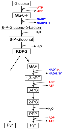 - Folosește enzimele dehidraza 6-fosfogluconată și aldolaza 2-ceto-3-dezoxiglucozfosfatată pentru degradarea D-glucozei la piruvat.