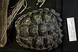 Calendar din carapace de broască țestoasă (irochez). Centrul carapacei are 13 solzi care reprezintă lunile lunare, iar înconjurul are 28 de solzi mici care reprezintă zilele lunii. Situl arheologic Droulers-Tsiionhiakwatha (2020).