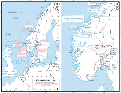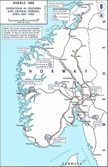 ![]() Forțele germane avansând lângă Bagn în Valdres · Artileria norvegiană în acțiune lângă Narvik · Regele Haakon al VII-lea și fiul lui, moștenitorul coroanei Olav în timpul unui raid german asupra Molde · Infanteriști montani (Gebirgsjäger) lângă Narvik · Bombardamentul german al fortăreței de coastă Oscarsborg | |||||||