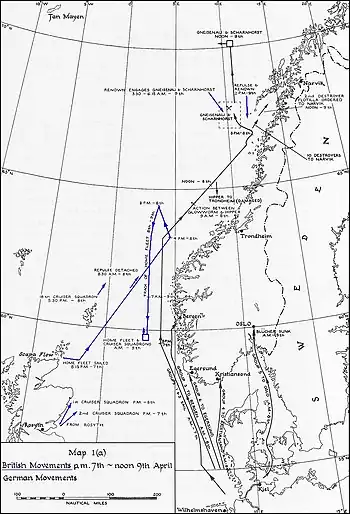 În acea noapte, după ce tot mai multe vase germane au fost reperate la sud de Norvegia, Charles Forbes a început să se îndoiască de faptul că germanii ar încerca spargerea blocadei și a ordonat în consecința Home Fleet să schimbe direcția de deplasare spre sud, spre Skagerrak. De asemenea, el a ordonat HMS Repulse și unui alt crucișător și câtorva distrugătoare să se îndrepte spre nord și să se alăture lui Renown.