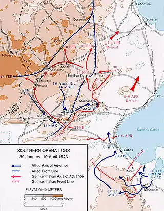 Atacurile neîntrerupte ale americanilor au forțat în cele din urmă trupele germano-italiene să se retragă spre nord. Infanteria marină italiană, fortificată la Wadi Akarit, având la dispoziție o mare cantitate de arme automate și muniție, au reușit să reziste multă vreme. Totuși britanicii au reușit în cele din urmă să le depășească pozițiile, cu mari pierderi pentru ambele tabere.[22]