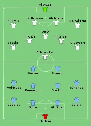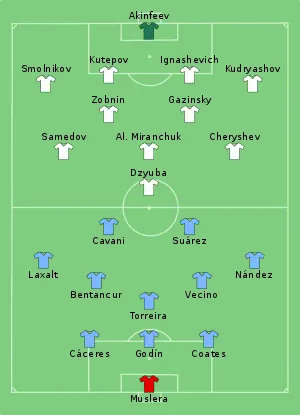 Cele două echipe s-au întâlnit într-un joc anterior, un amical în 2012, care sa încheiat cu o egalitate de 1-1. Jucând ca echipa națională de fotbal a Uniunii Sovietice, cele două echipe s-au confruntat între ele de șapte ori, inclusiv două meciuri la Cupa Mondială, unul la Campionatul Mondial de Fotbal 1962 faza grpelor, câștigat de Uniunea Sovietică 2–1, iar celălalt la Campionatul Mondial de Fotbal 1970 sferturi de finală, câștigat de Uruguay 1–0.[12]
