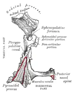 ![]() Osul palatin stâng. Aspectul posterior. Mărit. (Canalul pterigopalatin indicat în partea stângă centrală.) | |