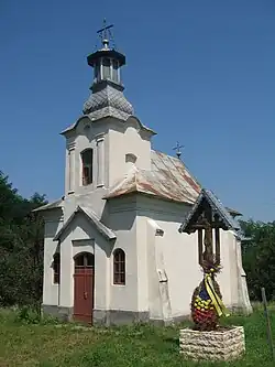 În spatele capelei, în apropierea locului unde a fost altarul bisericii de lemn, se află o cruce de piatră. Pe partea din față a crucii este scrisă următoarea inscripție cu caractere chirilice: "Aice(a) odihnesc robii lui Dumnezeu parohul Ioan Popovici cu soțiea sa prezv. Mariea. Vecinica lor pomenire. Vărsta viăți 74 an(i).", în timp ce pe partea din spate este inscripția: "Sau așăzat cu cheltueala paroh(ului) Vasilie Popovici spre pomenire. 1857"