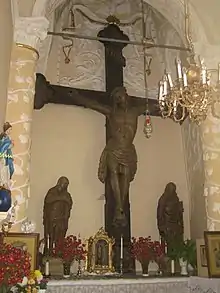 În interiorul capelei se află un grup statuar de importanță deosebită pentru arta gotică din România. [8] Această lucrare reprezintă pe Isus răstignit încadrat de Maria și Ioan și a fost sculptată în anul 1417 de meșterul Peter Lantregen din Austria. Grupul statuar este format din Crucea pe care este răstignit Mântuitorul, având la capete simbolurile celor patru evangheliști. La picioarele crucii se află statuetele Sfintei Fecioare Maria (Maica Îndurerată) și a Sfântului Apostol Ioan.