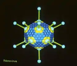Subunităţile galbene şi albastre sunt capsomerele capsidei virale la un Adenovirus