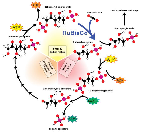 La baza vieții bazate pe carbon se află procesul de carboxilare care cuplează dioxidul de carbon atmosferic cu o glucidă. Acest proces este de obicei catalizat de enzima de carboxilare RuBisCO sau ribulozo-1,5-bisfosfat carboxilază/oxigenază, posibil aceasta fiind una dintre cele mai abundente proteine de pe Pământ.[7][8][9]