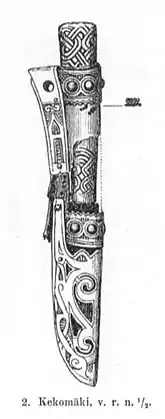 ![]() Desen al unui cuțit carelian cu teacă, datând din Epoca Fierului, descoperit în Käkisalmi. Desenul au fost făcute de Theodor Schwindt în 1893 |