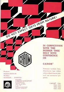 În 1963 s-a obținut primul cauciuc sintetic românesc,[43] prin copolimerizarea în emulsie a butadienei cu α-metilstiren,[29] purtând denumirea comercială CAROM.[9][43] În aceeași perioadă a început să producă și instalația de polistiren.[43] În prima etapă era estimat să producă 25 000 tone/an de cauciuc sintetic.[52] Cauciucurile sintetice de tip butadien-stirenic înlocuiau cauciucul natural în proporție de 50–60 %, fără a compromite produsele fabricate din ele.[42] În industria prelucrătoare, cea mai consumatoare a fost cea a transporturilor autor, în special în anvelope. Din cantitatea de anvelope fabricate, circa 70 % reprezentau anvelope grele de camion și tractor și numai 30 % anvelope ușoare, datorită mecanizării agriculturii, volumului de construcții civile și industriale și a transportului auto.[42]