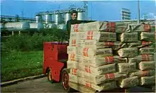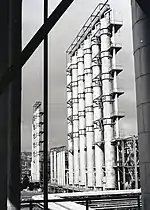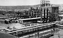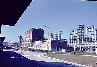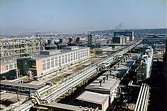 ![]() Combinatul văzut parțial dintr-o instalație, în planul depărtat tabăra (colonia) muncitorilor și un fragment dintr-un fost sat. În ultimul plan, Onești. | |