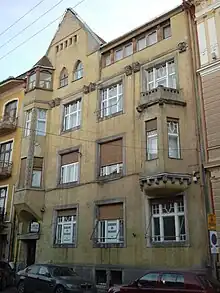 Clădirea are 3 etaje și mansardă, elementele de decorație din planul fațadei fiind ceva mai reduse, frumoasă proporționare dintre goluri și plin conferă clădirii o înaltă ținută estetică. Astfel de elemente sunt bovindoul de deasupra porții de acces, cel din cealaltă extremitate, precum și timpanul triunghiular amplasat parțial deasupra bovindoului principal.[2]