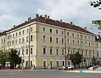 Etajul de sus a fost ocupat de Societatea Civică din 1880 până la dispariția acesteia în anul următor. Tot la etajul superior, la începutul anilor 1900, și-a amenajat biroul notarul regal István Gidófalvy. La parter se afla magazinul de lenjerie de pat și lenjerie de pat al lui Tamás Tamási, fondat în 1859, cu un departament separat de covoare pentru clienții burghezi și aristocrați. Alături, János Gámentzy a deschis un "magazin de modă fină" pentru femei. Pe partea dinspre strada Deák Ferenc se aflau faimosul magazin de hârtie Bernát și restaurantul Lukullus. La începutul secolului al XIX-lea, în sala de la primul etaj erau organizate spectacole de teatru de către trupa maghiară, până când aceasta s-a mutat în Teatrul de pe Ulița Lupilor.[3]