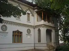 Imobilul, în suprafață construită de 460 m.p. (parter și etaj), cu 41 de încăperi, este prevăzut la etaj cu două cerdace, unul pe latura de vest și altul pe latura de sud, susținute de stâlpi de lemn sculptați. Ceea ce se poate admira în mod deosebit la acest monument este ornamentația sa din ceramică smălțuită policrom, cu diferite motive inspirate din arta veche românească. Partea centrală a imobilului ce separă parterul de etaj, este încins cu un proeminent brâu torsionat, ce se sprijină pe un registru de nișe, un fel de „ocnițe", în interiorul cărora sunt încastrate câte o sferă înconjurată de un cerc. Deasupra ferestrelor de la etaj, se află alt registru ornamental, cu elemente luate, probabil, din „pomul vieții", ilustrat printr-un ghiveci din care se înalță trunchiul trifurcat, cu mlădițe volubile, frunze și fructe puternic stilizate. La partea superioară a registrului, în dreptul cornișei, există un alt brâu, puternic reliefat, alcătuit din motive florale stilizate, iar la partea inferioară un chenar vălurat din arcuri frânte, care ornamentează ferestrele de la etajul clădirii întocmai ca o draperie.