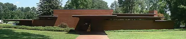 Vedere stradală a Rosenbaum House; se poate vedea structura plană pe diferite nivele a diferitelor părţi ale acoperişului.