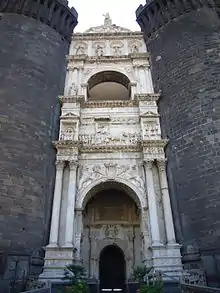 Impunătorul arc de triumf din marmură albă, construit în 1470, rememorează intrarea lui Alfonso de Aragon în Napoli în 1443. El se află între două turnuri vestice ale castelului angevin. Designul de ansamblu a fost atribuit lui Pietro di Martina, un arhitect milanez, sau, după Vasari, lui Giuliano da Maiano. Autorii moderni atribuie designul lui Francesco Laurana.