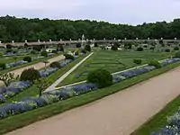 În stânga, splendid parcul Dianei de Poitiers, străjuit de imobilul administrației. Desfășurată simetric, în partea dreaptă, este grădina magnifică a Caterinei de Medici. Pe terasă se ridica donjonul vechiului castel Marques, remaniat de Bohier. Pe el sunt înscrise inițialele TBK (Thomas Bohier și Katerine) care se regăsesc și în alte locuri din castel, ca și deviza „S’il vient à point, me souviendra” („Dacă se va împlini – construcția castelului, vă va aminti de mine”). Alăturată, o fântană cu emblema familiei Marques, un vultur și o himeră.