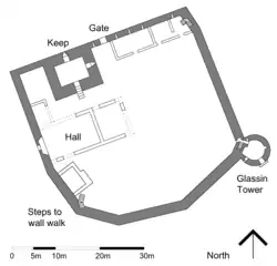 Castelul este format dintr-o curte dreptunghiulară, înconjurată de o curtină, cu un donjon într-un colț și turnul rotund Glassin amplasat în colțul opus. Fundațiile unei serii de clădiri acum demolate rămân de-a lungul a două laturi ale curții. Din curtea exterioară, numai un banc de pământ arată poziția pereților, resturile fragmentare ale unei brutării fiind singurele structuri vizibile.