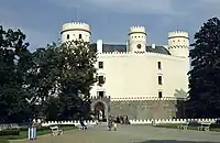 Interioarele sunt, în principal, în stil Empire, din prima jumătate a secolului al XIX-lea. Sala Lovecký (Sala vânătorului), cu o boltă cvadripartită cu nervuri ogivale, este în stil gotic, iar capela datează, de asemenea, din perioada gotică și are o boltă cu nervuri. Din punct de vedere artistic, camerele cele mai valoroase sunt camerele de stat de la primul etaj; sala mare și cea mică a cavalerilor; sala vânătorilor; saloanele albastru și imperial; biblioteca și galeria armelor. Spațiile interioare sunt mobilate în stilul perioadei respective și conțin colecția de lucrări de artă ale familiei.