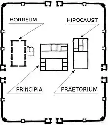 Castrul are formă dreptunghiulară, cu laturile de 132 m și 98 m. În partea centrală a incintei au fost clădite horreum (magazia de cereale), clădirea ofițerilor, principalia (comandamentul), praetorium (clădirea comandamentului castrului). De o parte și de alta a acestor construcții de piatră, la nord și la sud, erau plasate hibernalia (barăcile soldaților).