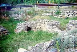 În situl arheologic din apropiere au fost găsite fragmente de olane romane, provenind din rețeaua de alimentare cu apă a castrului și așezării civile din sec. IV p. Hr. [2] precum și o instalație de aducțiune și de distribuire a apei săpată în piatră.Castrul roman de la Pietroasa (124 m x 158 m), cuprinde și termele (băile termale romane) înconjurate de zidul sudic de apărare, aparținând de cultura Pietroasa.